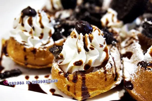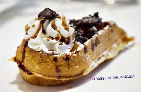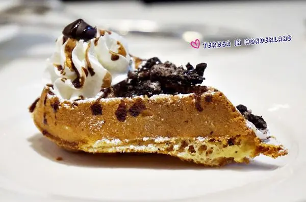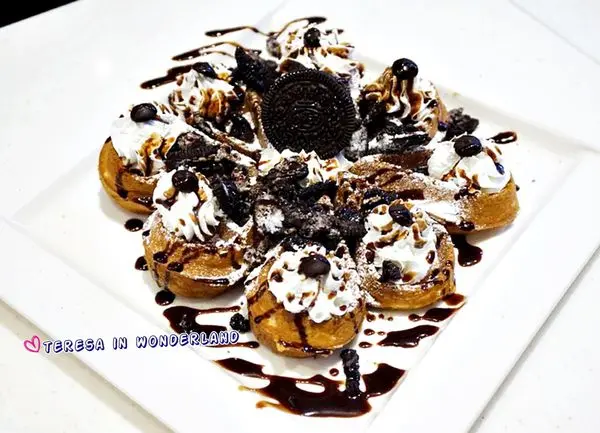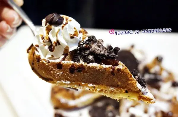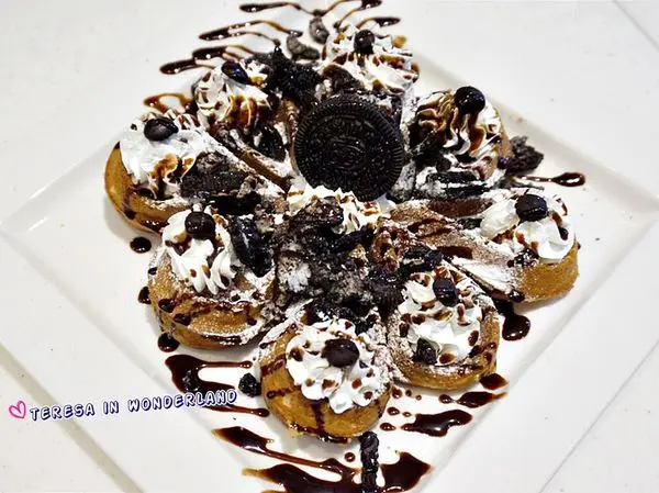 鬆餅以水滴造型呈現,並在上頭大氣地撒上OREO碎片、及以鮮奶油點綴,視覺分數很高的一道甜點