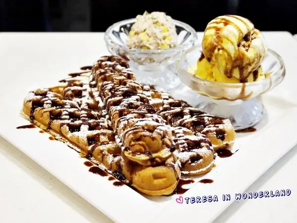 鬆餅上頭撒上糖粉、並淋上巧克力醬,讓身為甜點控的大食女姊妹倆,看了都躍躍欲試!!
