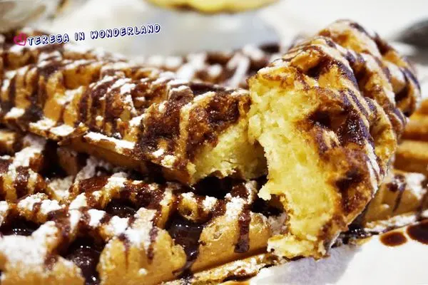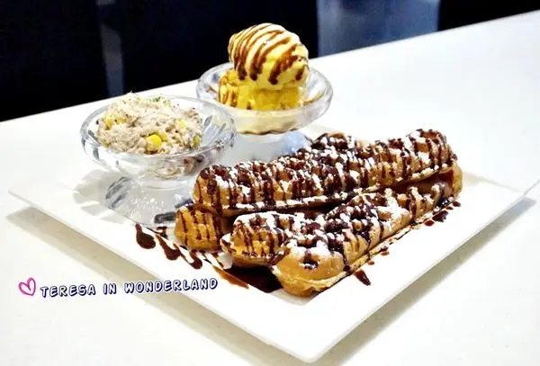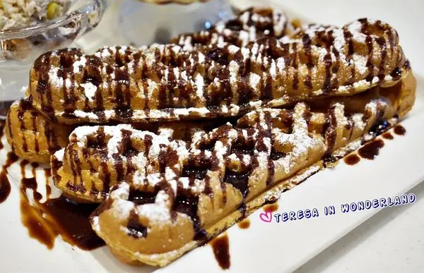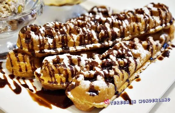 一般看到的鬆餅不外乎扇形狀、水滴狀、或是圓形鬆餅,這還真是大食女第一次看到長條狀的鬆餅!!(眼睛睜大