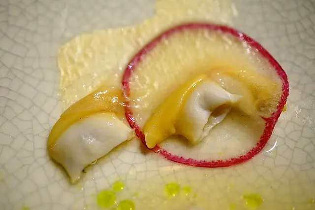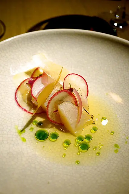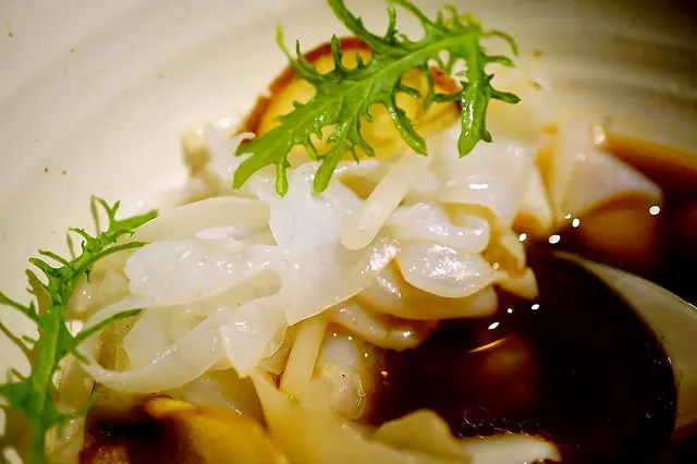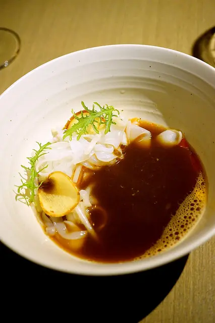 Smoked engawa, crosnes, prawn broth, arrowhead