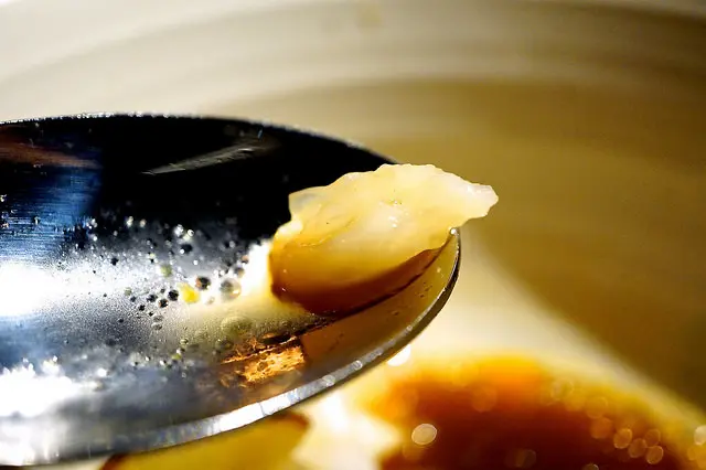 立體的咖啡色薄片是煎干貝後,干貝汁收乾所造成的精華