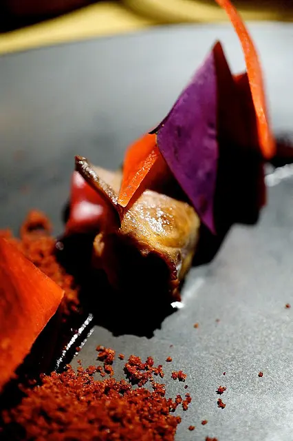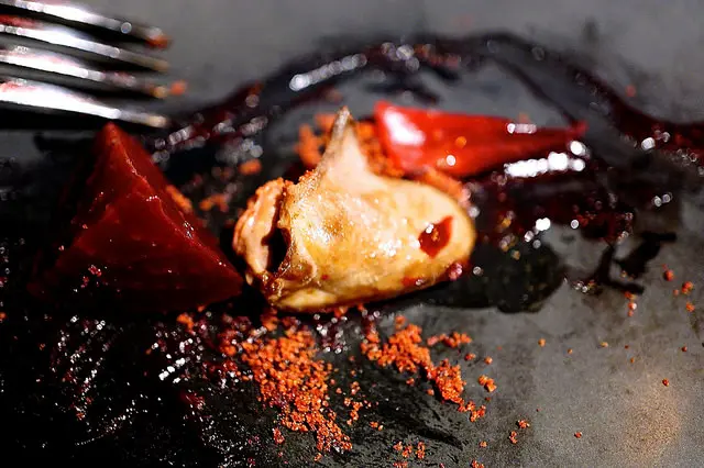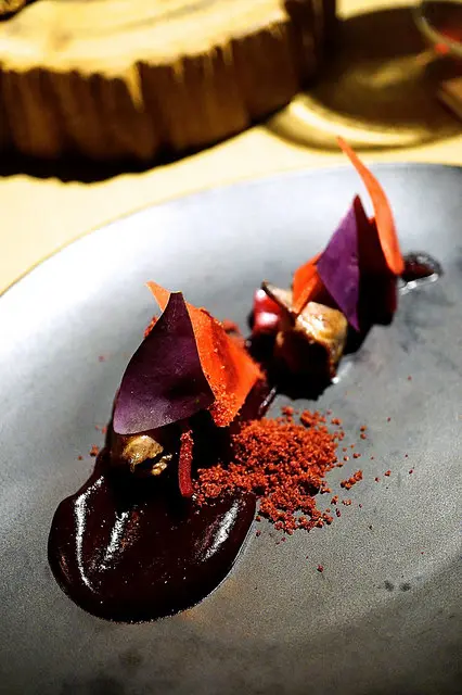 Duck hearts, beet crumbs, pickled roselle, oxalis, beet condiment