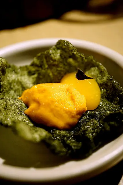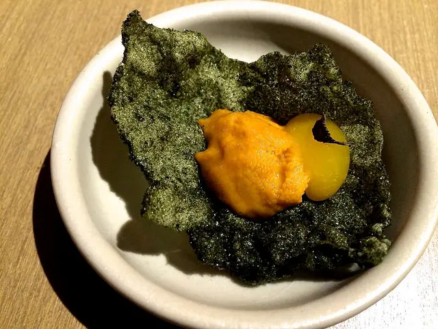 最底下是米餅撒上海苔粉,再放上海膽