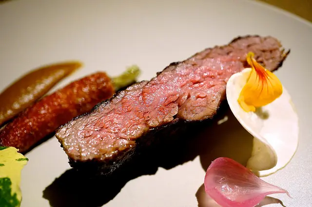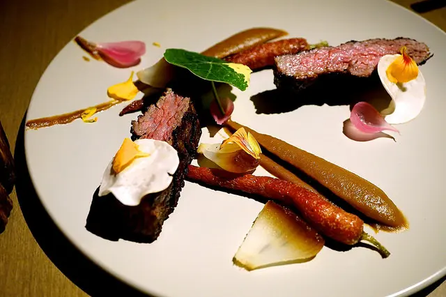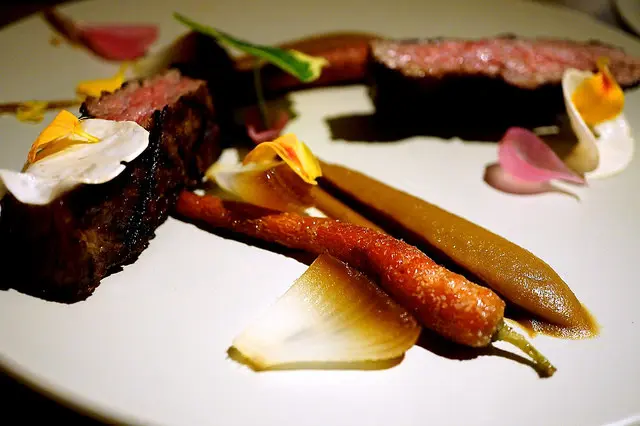 Slow cooked shortrib, roasted baby carrot, charred onion, nasturtium