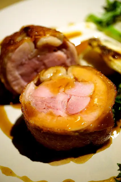 往內分別是杏色和粉紅色的雞肉,肉質往內也更加軟嫩