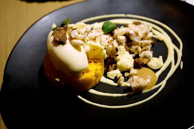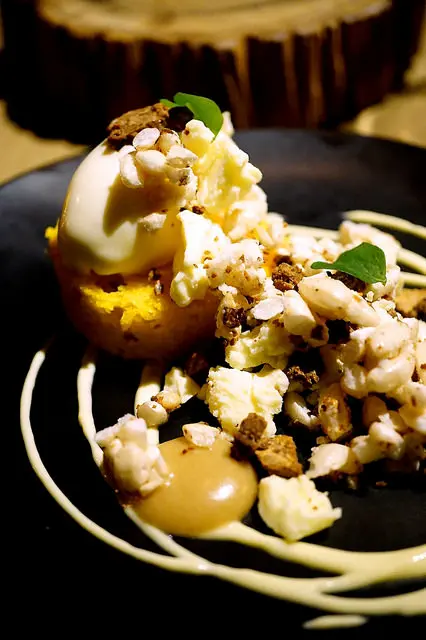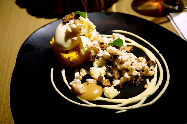 最後的甜點:南瓜蛋糕佐以檸檬酸奶sorbet、台灣爆米香、焦化白巧克力和檬檬醬