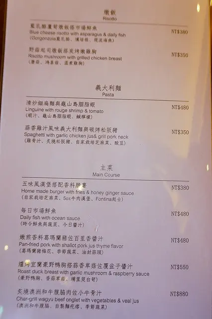Menu, 包括前菜、燉飯、義大利麵、主菜、甜點