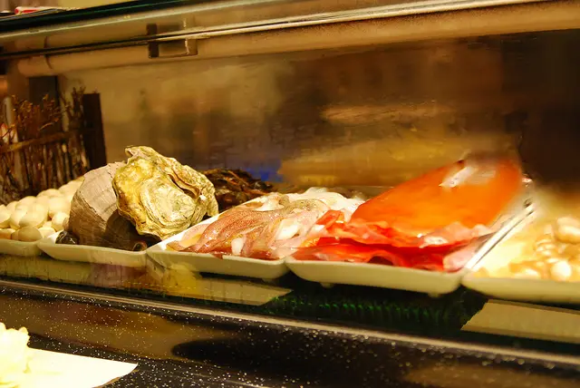吧枱前的新鮮食材有超大牡丹蝦、超大甘貝、新鮮生蠔,