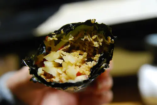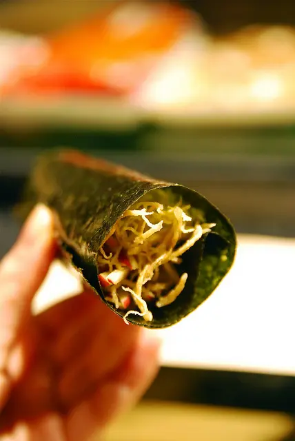 酥脆的海苔,除了包入爽脆的牛蒡絲以外,還加了蘋果絲,佐以芝麻醬