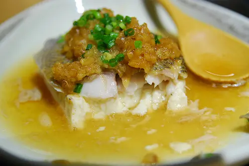 黃雞魚蒸過後,上面部滿蒜頭泥和蔥花