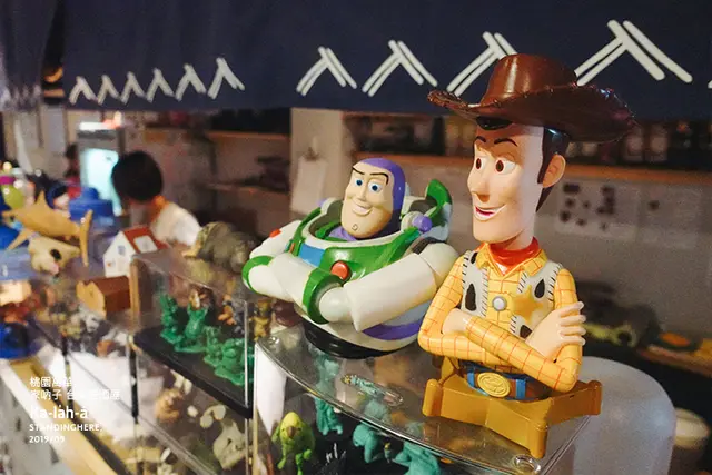 在吧台上放滿了大大小小的玩偶:玩具總動員、杯綠子、海綿寶寶、宮崎駿...