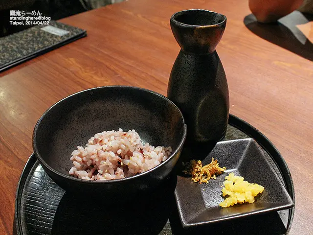以用麵稍為沾一下就可以了, 太多可能會受不住!叉燒肉帶一點焦香, 肥瘦軟硬都適中, 筍干也煮得很入味喔!沾麵特別的是, 吃完還會送上御飯組... 一小球紫米飯, 加入小盤中的配料, 淋上沾麵用的醬汁,再加上高湯做成湯泡飯... 也很好吃! 風味十足!