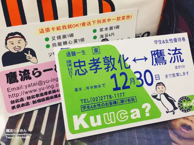 付完帳時, 店家還給了三張做成 suica (日本的交通卡) 樣子的優惠券,但上面寫著學生 & 女性優待,不知道男性顧客能不能用就是了啦...