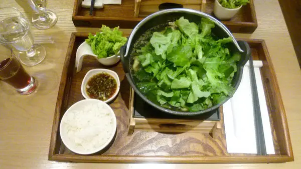 旁邊附上生菜、火鍋沾醬,飯/麵條。