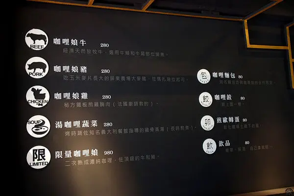 雞、豬、牛及蔬菜咖哩均280元,卵指的是歐姆蛋,包是咖哩麵包。