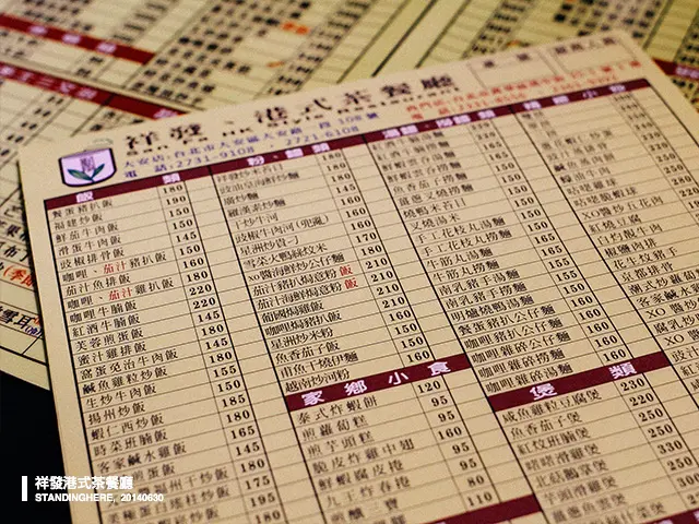 祥發的菜單幾乎沒變, 還是長得這個樣,一大張的墊在桌下, 和香港茶水攤、波記茶餐廳都一個樣...不過比對一下 2010 年的文章, 價錢倒是平均漲了 5~20 元,也無可厚非啦, 現在就是個萬物齊漲薪水不漲的年代嘛 (掩面痛哭)