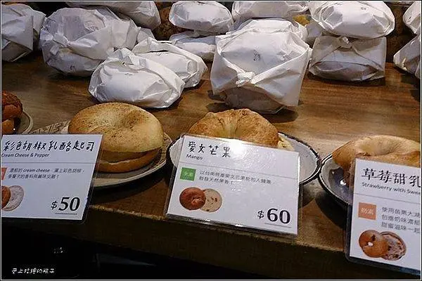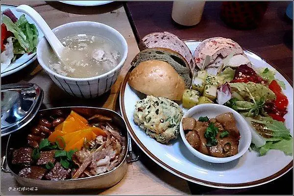 幾塊貝果、起士、配菜、沙拉和一碗湯