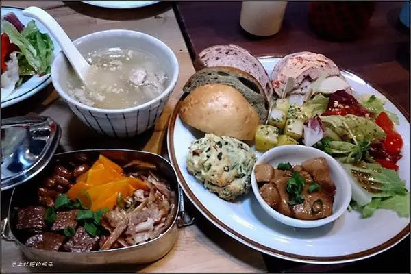 幾塊貝果、起士、配菜、沙拉和一碗湯