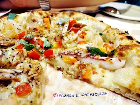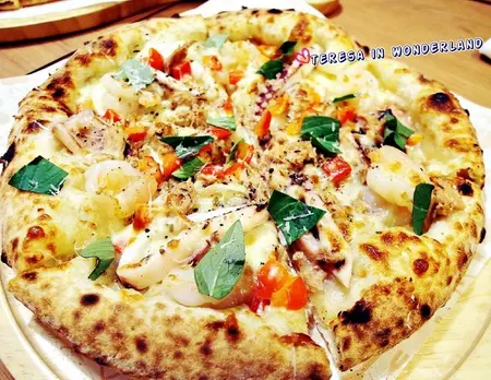 厚實的餅皮上頭,鋪滿起司絲、鮪魚,再大把大把撒上透抽、蝦仁、洋蔥、及帕達諾起司,並以紅椒、俄立岡葉點綴提味