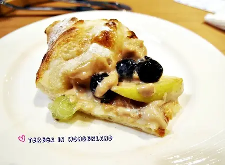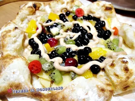 在此也要小小提醒捧油們,拿得時候,最好以餐具輔助阿~不然Pizza放到盤子前,上頭的水果就掉滿桌啦!