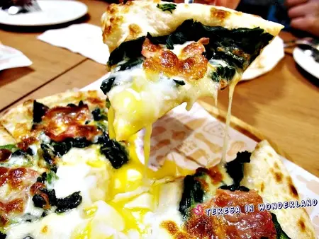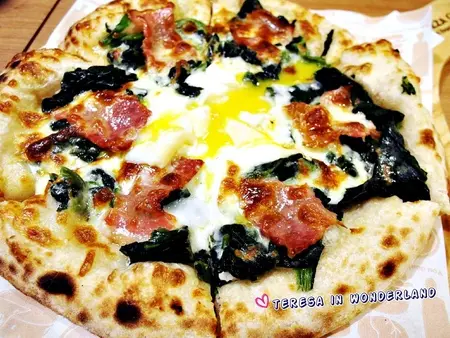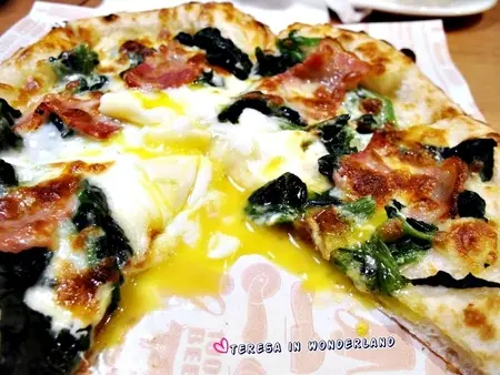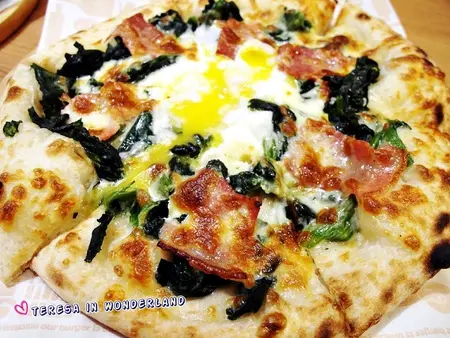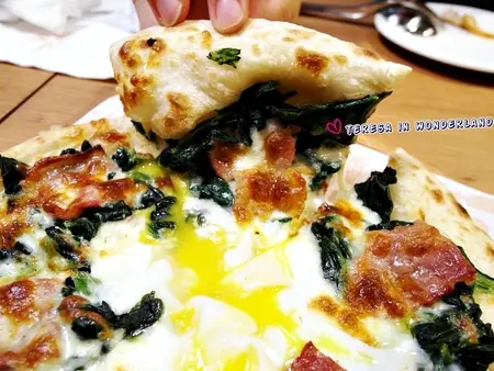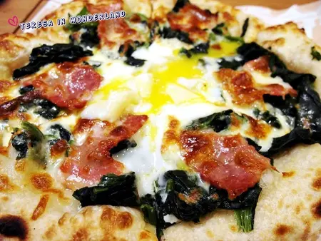 佛倫提那(驚豔滿分!)榮登大食女本日最滿意的Pizza!滑嫩順口的金黃蛋液、佐著烤至微焦的培根、及菠菜,搭著扎實有嚼勁的焦香餅皮,讓人幸福到想轉圈跳舞阿‵(*^v^*)′