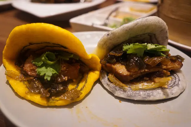 鋪上一成花生粉後 在夾取一塊適中大小的肉片 加上梅干及酸菜 最後加點提味的香菜