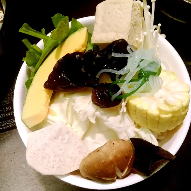 黑木耳、蒟蒻、玉米、南瓜、芋頭、香菇、金針菇、凍豆腐