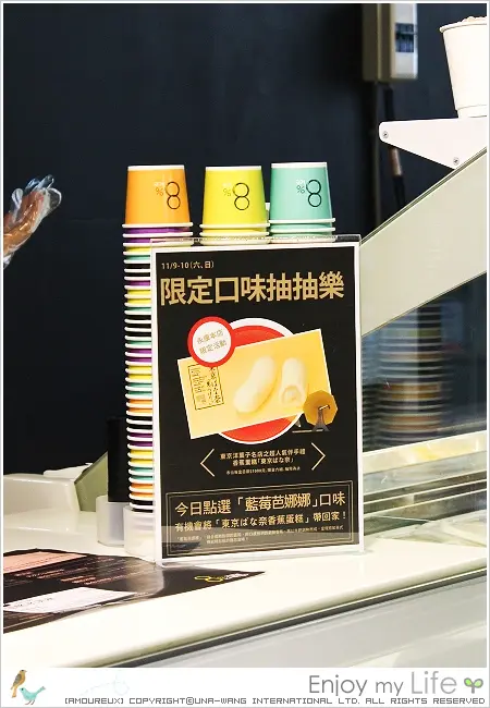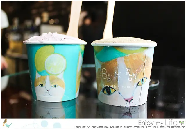 冰淇淋選了貓貓波麗露奶茶與藍莓芭娜娜,純粹是看名字可愛又好聽才選了這兩種口味哈,順帶一提,8%的冰淇淋沒有提供試吃服務,當天有香港遊客詢問就剛好聽到