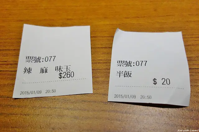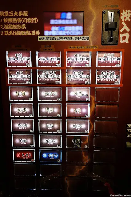 等到快要輪到自己時,店員會告知要先進店裡用購票機買好餐券,再出店外等接下來有空位時就可直接入座,感覺有加快點餐和結帳的速度,鬼金棒的拉麵只有分成基本款的辣麻味噌拉麵(230元)和豪華款的特製辣麻味噌拉麵(300元)兩種,其他的都是一些加點配料和米飯類,也有幾種基本版與配料組合好的快速選項,麵的分量是固定的,加大的費用則是+30元,比較特別的是這裡的拉麵有辣度與麻度可以調整,都分成「無/少量/普通/增量/鬼增量」五個等級,如果選擇鬼增量的等級需要+30元,辣&麻兩種都鬼增量就是+60元,照著機器的操作說明付款完成後,會將食券與發票找零一起吐出,相當方便。
