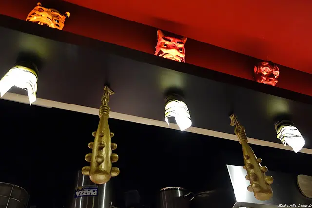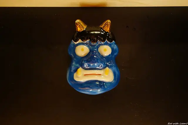 店內的裝潢元素都與鬼有關,像是上方的鬼面具以及座位前面牆上的小鬼,另外要注意這裡禁止對廚房內進行任何拍照或錄影,內場總共有三名工作人員,雖然感覺人手蠻夠的,但由於湯和炒豆芽是用同一個爐子,而一次起鍋又頂多只能作兩碗麵所需要的湯或豆芽,也因此到上桌前得再多花點時間。