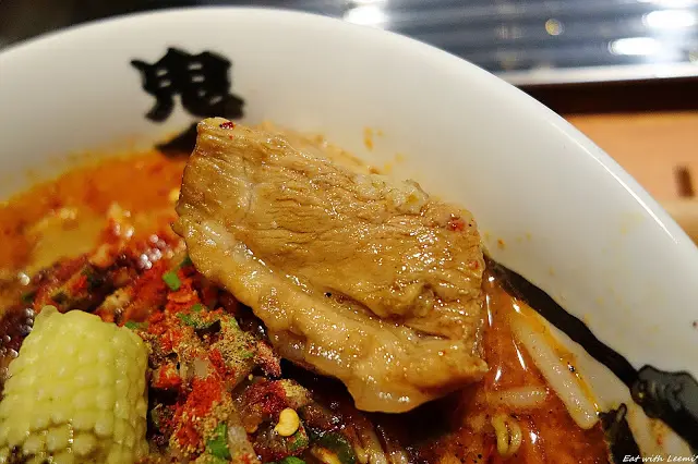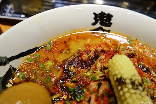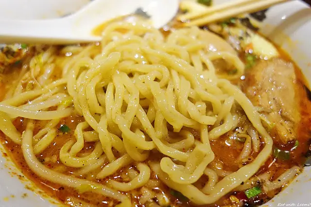 鬼金棒的湯頭風味我蠻喜歡的,是醇厚的味噌湯底襯上辣椒的辣與花椒的麻,麻辣的存在感高過味噌不少,且還多帶點溫潤的甘甜味,而不是平板的死辣,這樣的組合之下即使是有麻有辣的類型也覺得很好入口,整體雖是濃厚的類型但鹹度不會過高,對於偏愛日系拉麵的人而言應該都是很容易接受的程度,裡頭加的洋蔥碎我很喜歡,讓風味有所提升,以個人口味來說感覺這回麻度和辣度都點普通實在太保守了,應該直接從增量開始才對,吃這碗麵的時候一直覺得有中華料理的印象在,後來才發現這味道會讓我聯想到我喜歡的麻婆豆腐,應該也是因為花椒的緣故。