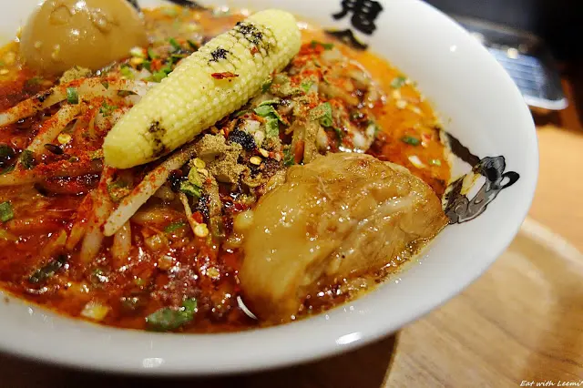 等了一陣子後我的味玉辣麻味噌拉麵上桌,算是有符合了對色香味的期待,基本款的主要配料只有一塊肉+玉米筍,糖心蛋是另外加購的。