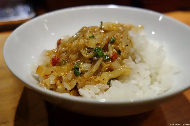 之前在鷹流惡鬼也吃過類似的麻辣味噌拉麵,但個人並不是很喜歡,不過這回鬼金棒的拉麵給我印象就很好,兩家店各自搭配呈現出的有所不同,鬼金棒的整體味道顯得的融洽許多,在麻這個風味的運用上也處理的比較好。半飯 20元