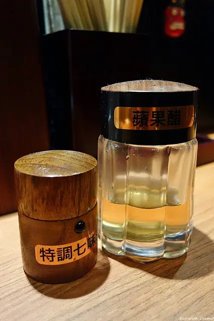 桌上的調味料是特調七味和蘋果醋,蘋果醋據說有平衡辣味的功效,試了一點並沒有很喜歡,另外內場有說當天進了新的調味料葡萄山椒,由於是限量供應,也許要運氣好才能試到了。