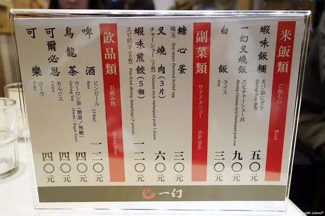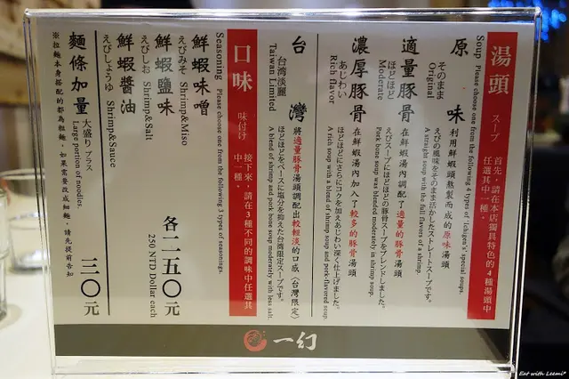 一幻的拉麵點餐方式是從分成四種湯頭(原味、適量豚骨、濃厚豚骨、台灣淡麗)及三種口味(鮮蝦味噌、鮮蝦鹽味、鮮蝦醬油)中各擇一搭配,麵條則分成粗麵和細麵,排列組合一下變化也不少,價格皆為250元,可另加30元將麵條增量,也有一些配菜可以單點,不另收服務費。
