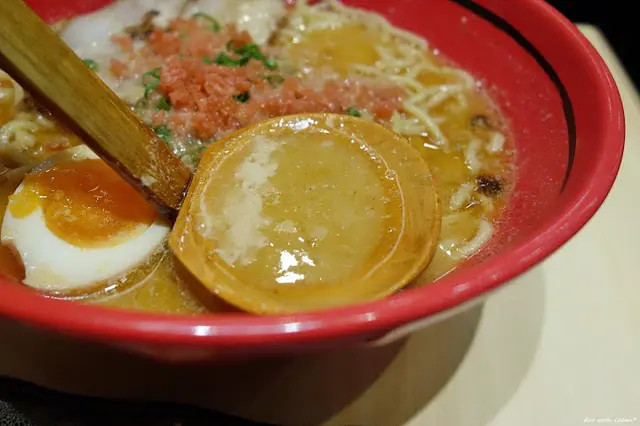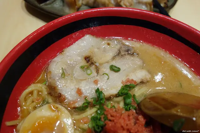 選擇口味時決定將本身就帶有點濃厚感的鮮蝦味噌搭配上適量豚骨,實際上確實也是蠻安定的組合,這碗的湯頭口感濃稠些,第一口的印象是蝦味滿滿,接著其他元素才跟上,味噌和蝦味湯頭還算合適,豚骨湯的部分又帶出了一點厚重黏口,以自己習慣的口味來說還算不上重鹹,但是多喝了幾口後不太喜歡留在嘴裡的質地,溫度稍降後這種感覺更明顯,撒在上頭的是用紅薑調色的炸麵酥,潤得很快,口感加分效果有限,倒是蔥花和味噌挺搭配。