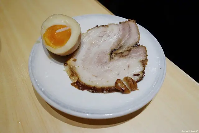 每碗拉麵都附上一片叉燒肉和半顆糖心蛋,參加打卡活動會再多贈送一片肉和半顆蛋,一幻的叉燒肉頗肥,泡在熱湯裡口感相當軟膩,豬味略重些,另外贈送的叉燒是冷的,肥油存在感太明顯,口感不佳實在感不怎麼討人喜歡,只能再泡到溫度已經略降的湯裡,不過效果也有限,糖心蛋頗一般。