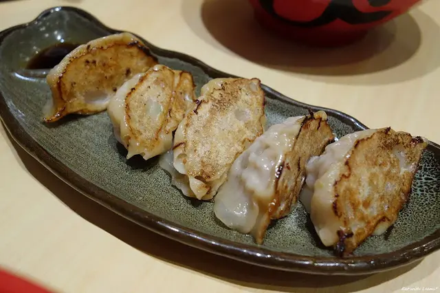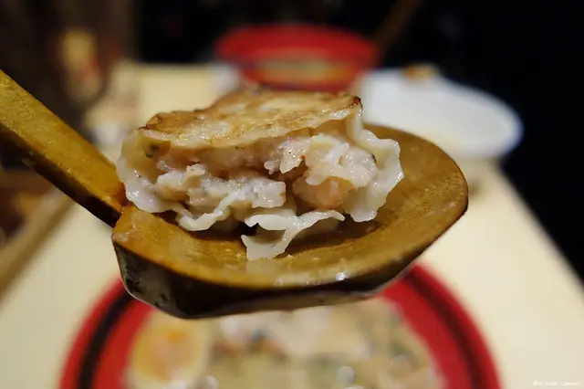 煎餃不是餡料填得很飽滿那種,湯汁也不多,不過每一枚當中都有包入整尾小蝦,味道調得偏重單吃即可,煎得略油一些趁熱吃較不易膩。