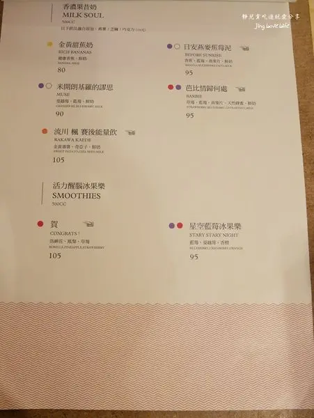 這裡的飲料分為三大類:果汁特調、香濃果昔奶、活力醒腦冰果樂