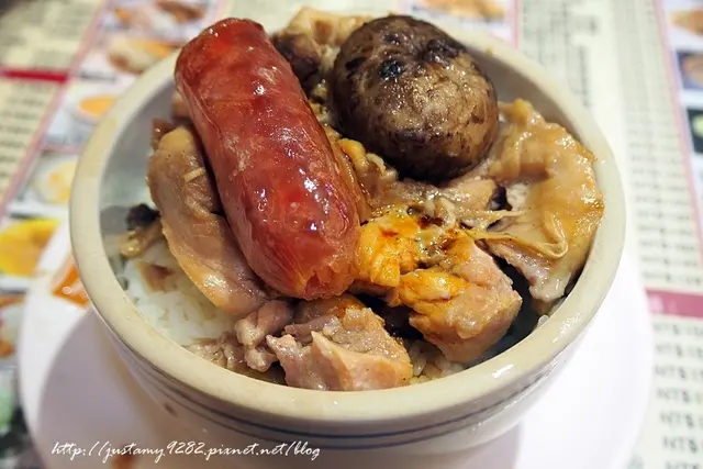 白飯上堆疊了~ 雞肉、香腸、大香菇再淋上特製醬油