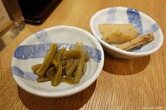 桌上擺著兩壺小菜可隨意取用,這天吃到的是牛蒡醃薑和皇帝菜,牛蒡醃薑的嗆味太強烈的實在不喜歡,而皇帝菜就是我們平常說的貢菜,脆脆的口感,風味也平易近人一些,不過說實話這兩個小菜我都沒有愛。天吉屋提供的茶水是溫的牛蒡茶,帶有很明顯的植物氣味(或是稱做土味),有種似乎很健康的錯覺......但如果今天是為了喝美味的我一定不會想喝這種茶。