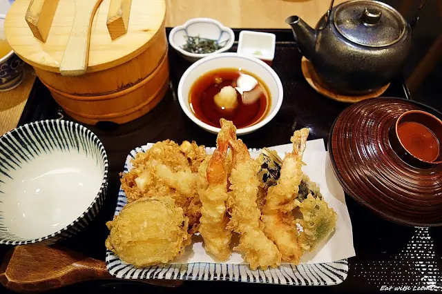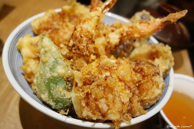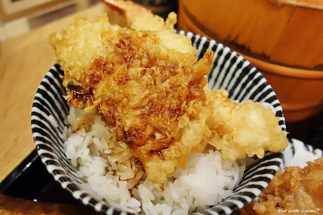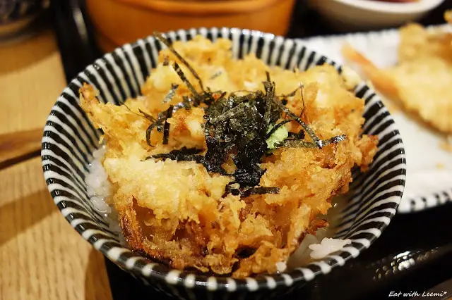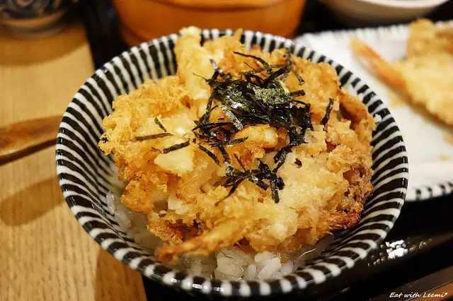 第二個就是將炸物擺在白飯上再淋桌上擺著的天丼醬汁,其實和第一個吃法的也只有醬料的差別而已,畢竟前面的吃法我想大家本來或多或少也都會配上一兩口白飯吧?不過兩種比較之下我喜歡天丼醬汁的風味多一點,甜鹹風味比較強烈,醬汁的附著力也比較好,和白飯拌一起頗開胃,不過味道重也比較容易膩就是了。