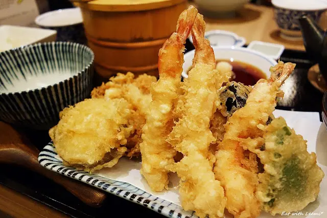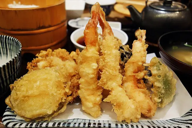 天幕御食的主菜內容包含三隻蝦、白身魚、真鯛、花枝洋蔥酥、茄子、青椒、地瓜,炸蝦的個頭不大,這裡的炸物炸衣偏薄且不油,酥脆好吃,蝦子的個頭不大但口感好,白身魚看菜單上日文是寫キス魚(鱚魚),風味平平,另外一款真鯛肉比較厚口感也細一些,好吃不少,而圓餅狀的花枝洋蔥酥則是一般般,洋蔥吸了油整體口感偏膩,花枝也有點少,至於其他蔬菜類都挑的不錯,地瓜有甜。