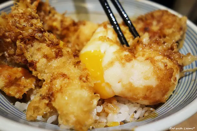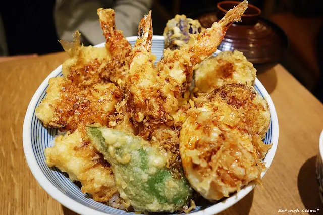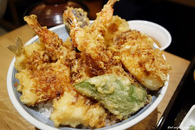 天吉丼送上桌時只有丼飯加一碗湯,和整份端上桌的天幕御食相比會覺得沒那麼豐盛,但仔細看看主菜內容其實大同小異,只是花枝洋蔥酥換成整片花枝,白身魚換成了炸溫泉蛋,兩份比較一下覺得應該點天吉丼就好了,厚身花枝的口感比切成小塊混在洋蔥裡去炸的更好吃,溫泉蛋的半熟蛋黃威力顯而易見,價錢也比御食便宜100元,要講缺點的話就是上桌時食材都已經事先淋好天丼醬汁了,沒辦法隨喜好調整,而且整碗都是同樣風味確實比較容易顯膩,不過我覺得御食三吃法雖然比較多變化,但兩份的差距還沒有多到100元的價值也就是了......