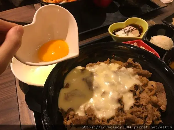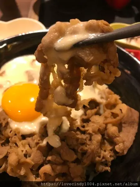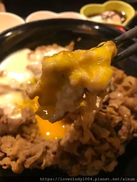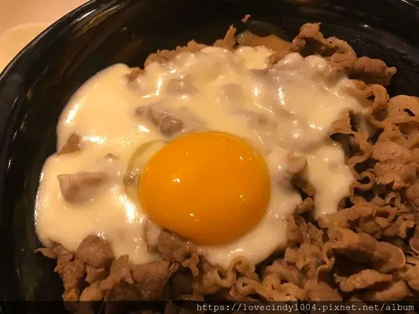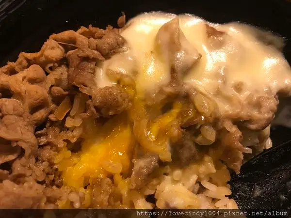 裹上生蛋黃液,融合起士與蛋液的牛肉丼飯,
