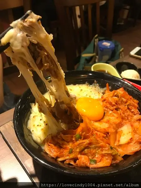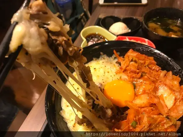整份丼飯被一半的牽絲乳酪與一半的韓式泡菜燒肉給塞滿!!