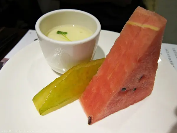 水果品質不錯,都有甜,這西瓜雖非當季,但水分飽滿且甜度夠。後面是來插花的茶碗蒸,雖然不錯吃但建議還是留點胃給其他食物。