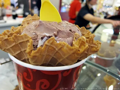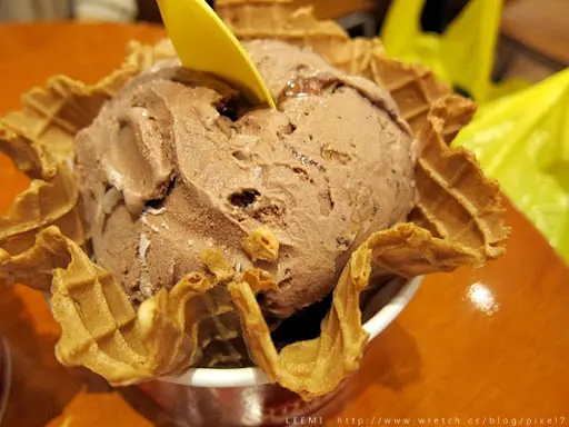 甜度頗高的巧克力德意志,除了主體的巧克力冰淇淋就蠻甜的之外,加上了布朗尼和焦糖醬肥胖度直接破表,胡桃和椰子絲則是為口感加分,撇開略甜這點之外,是個接受度很高的口味。