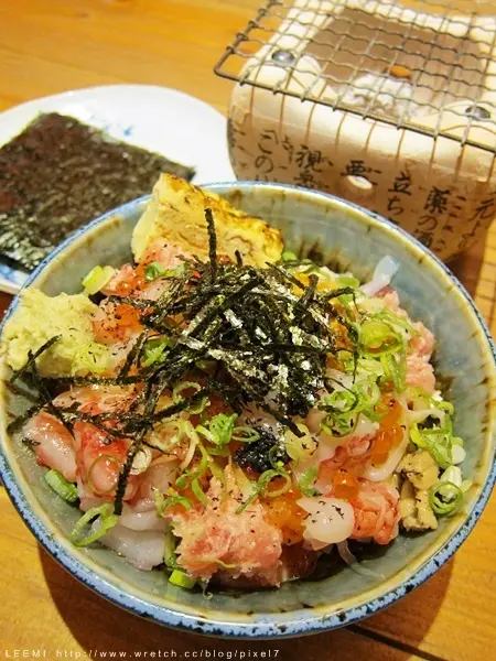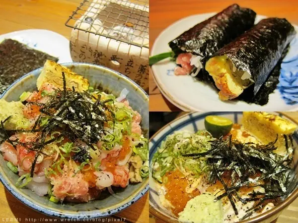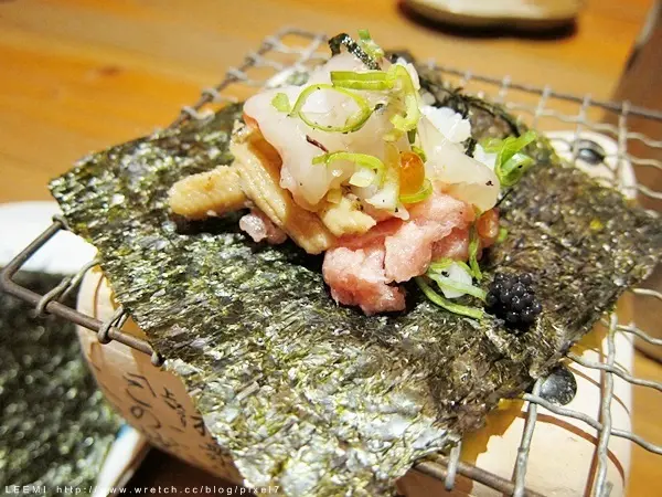 炭爐是拿來烤海苔用的,將散壽司與烤過的海苔做成手捲又是另一種吃法,一碗散壽司兩種變化挺有趣的。