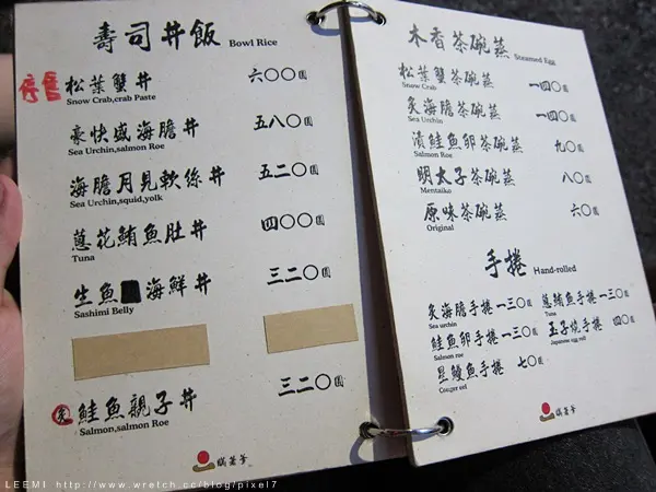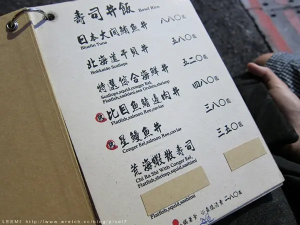 新版的菜單,不過補補貼貼註記的部分還不少,從以前就很不欣賞這種事後修改的菜單,若是家常小店還說得過去,既是這種規模的店家且一開始也用心將菜單製作成冊了,補貼的痕跡反而相當煞風景,若考量食材季節性或供貨問題可能導致菜單需要經常修改的話,還不如一開始就設計成容易替換的內頁,或是成本較低的點菜單方便整批更新不是更好?